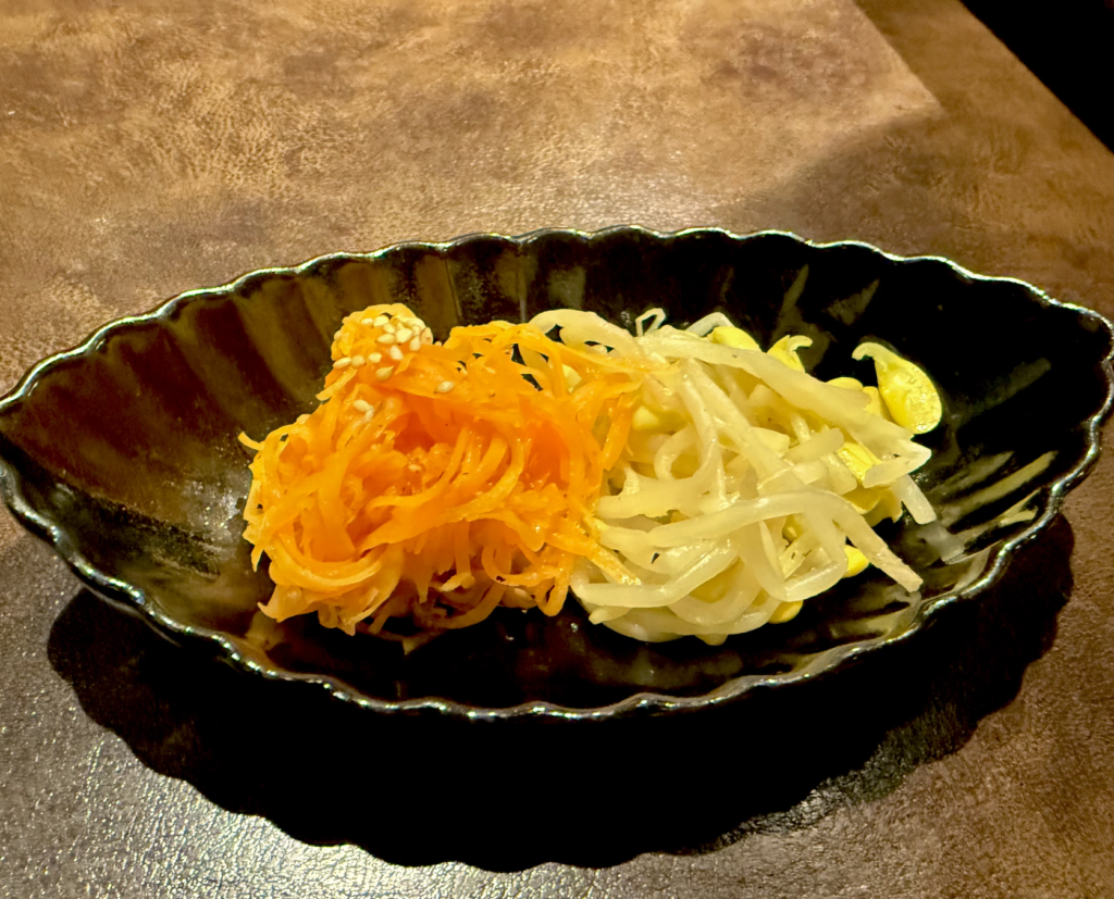 金時人参と豆もやしのナムル。胡麻油はごくわずかだけ、人参ともやしの食感を最大限に活かしたシャキシャキサラダ。うまいうまい。