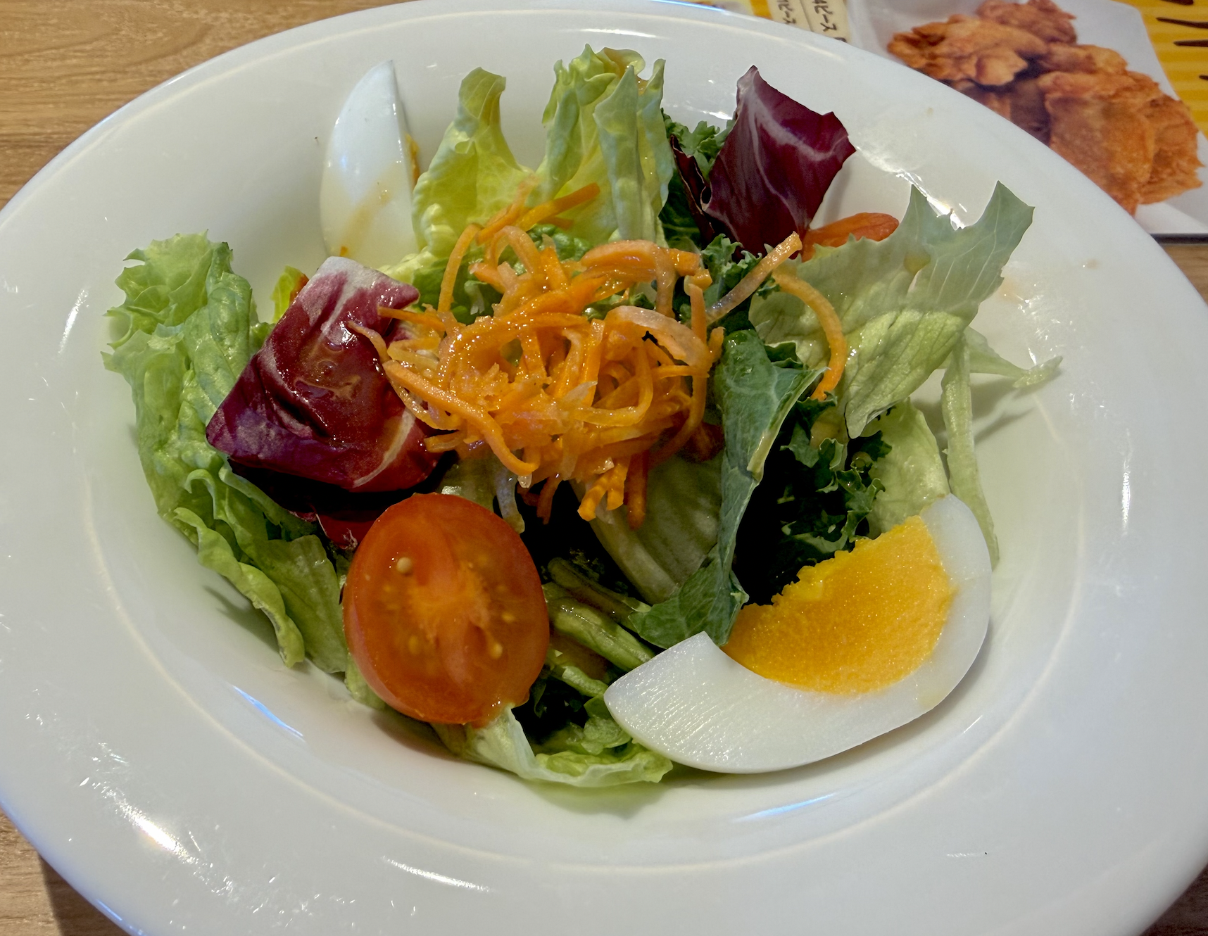 バジルなどのハーブがふあっと香る程度で、チキンそのものを楽しむ味付け。オカズと言うよりツマミのような‥そうだ、夜に来てデカンタワインの白で楽しむべきチキンだよ。