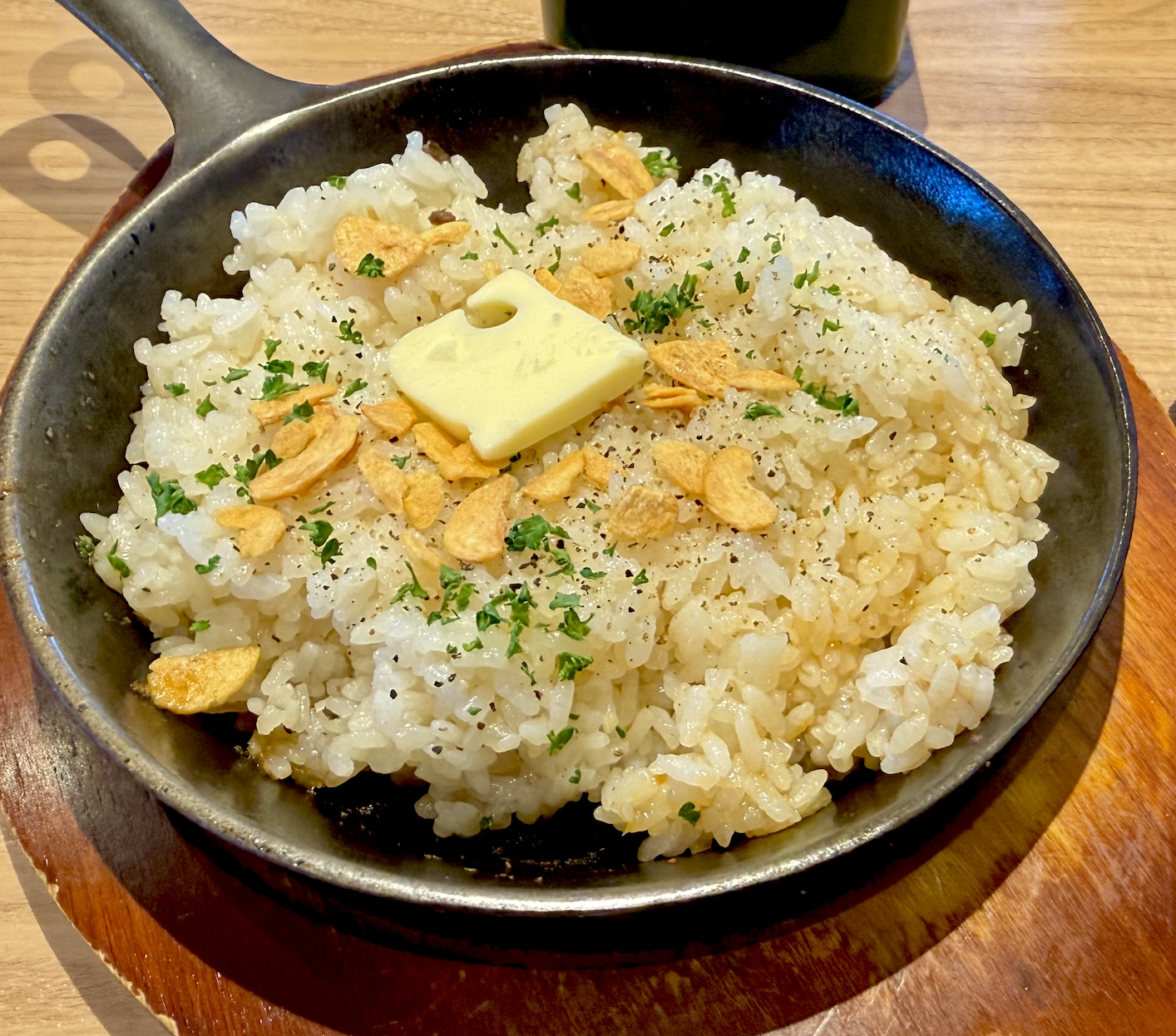 だがガーリックライスが刻々と焼けているのは間違いない。焦げつきすぎぬ前にバターを均等に混ぜるのだ。