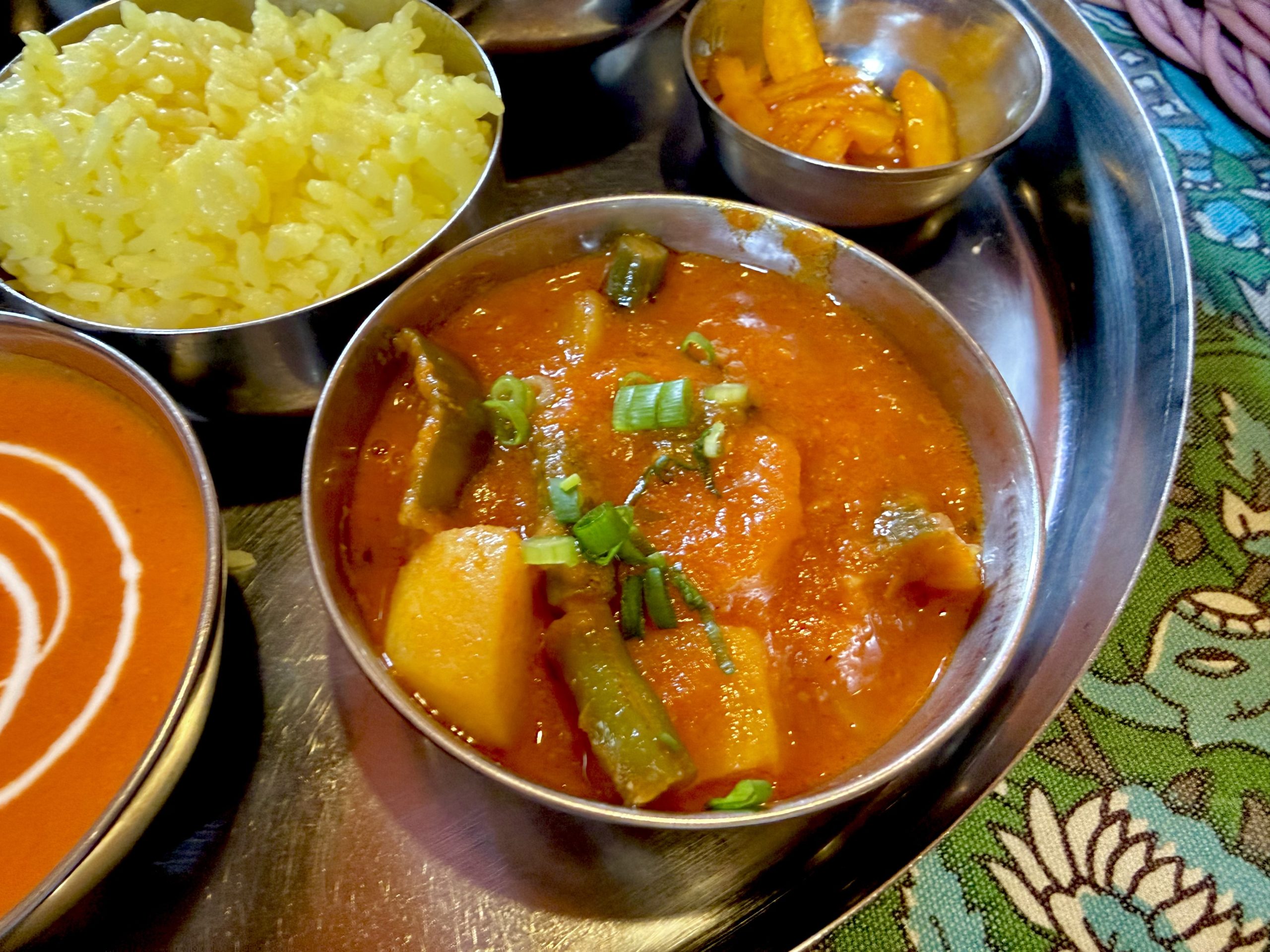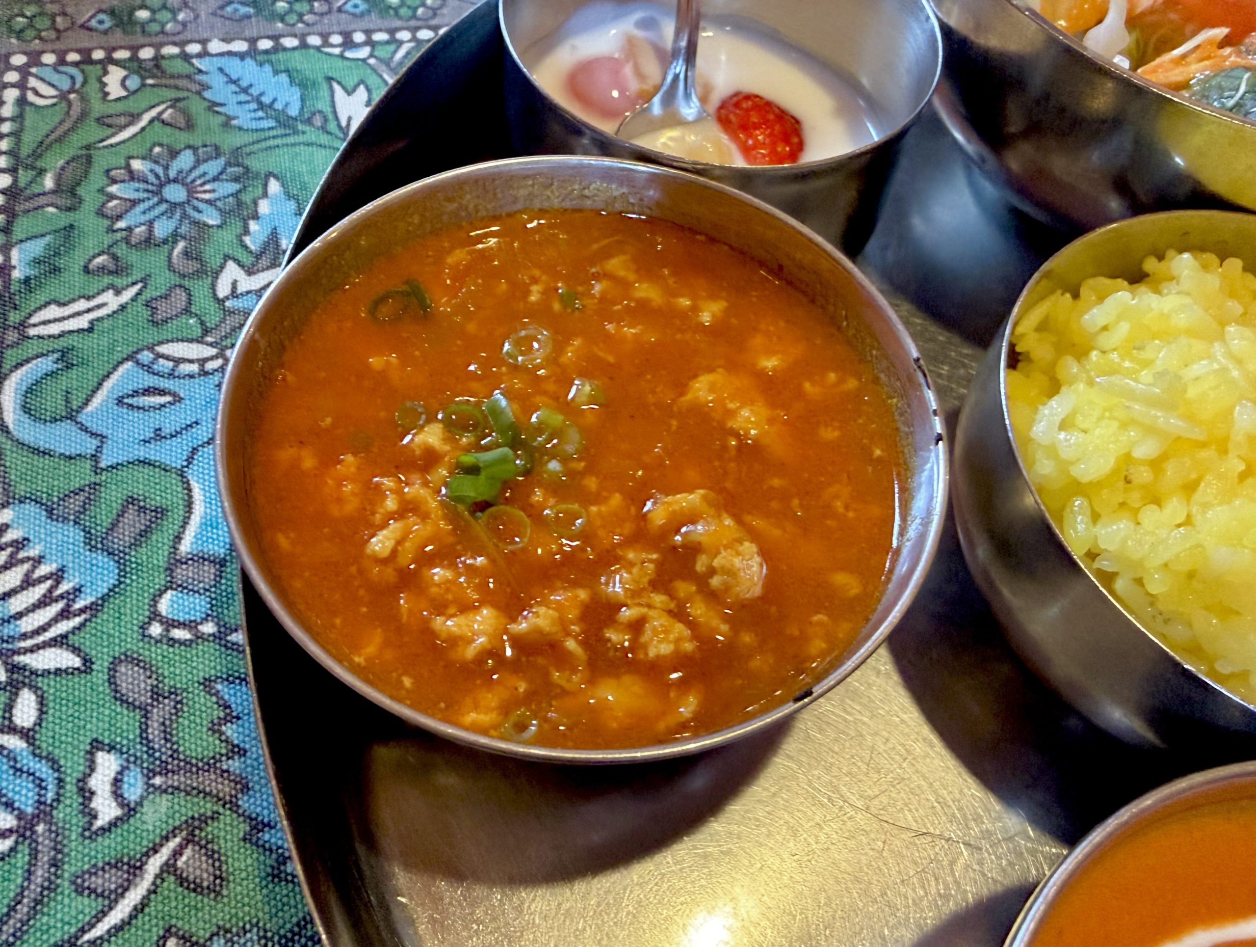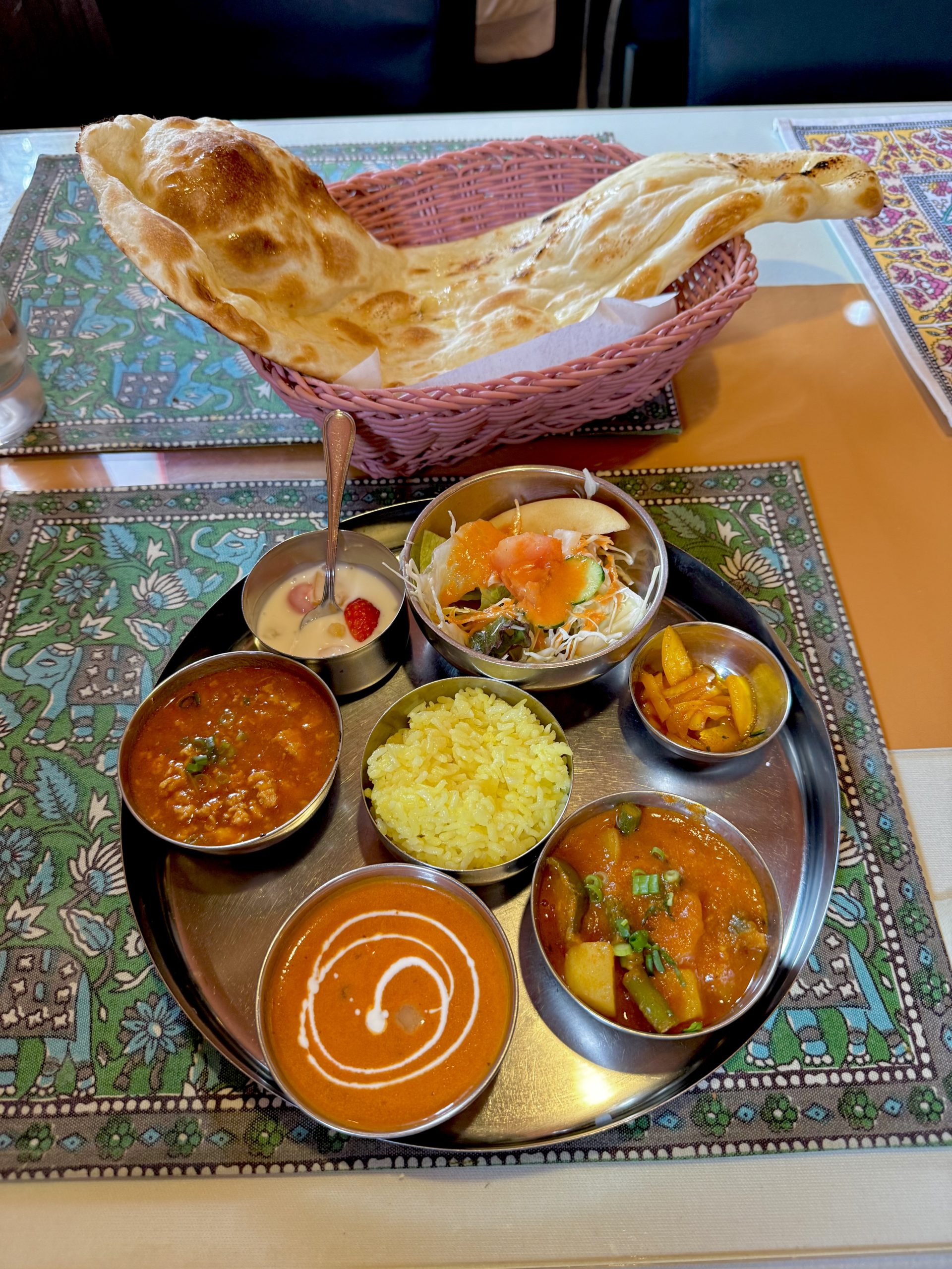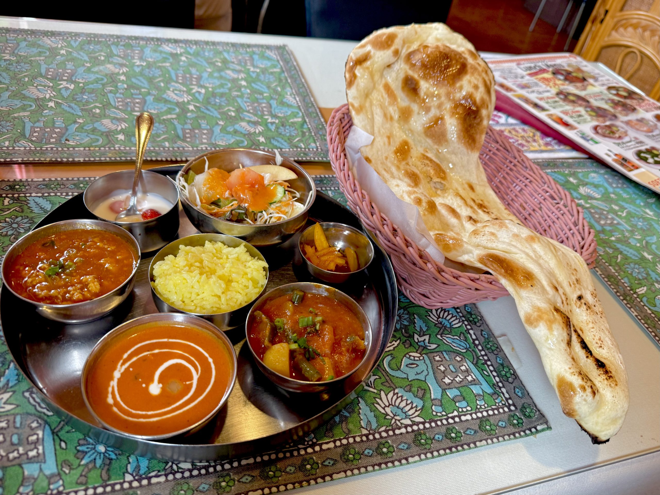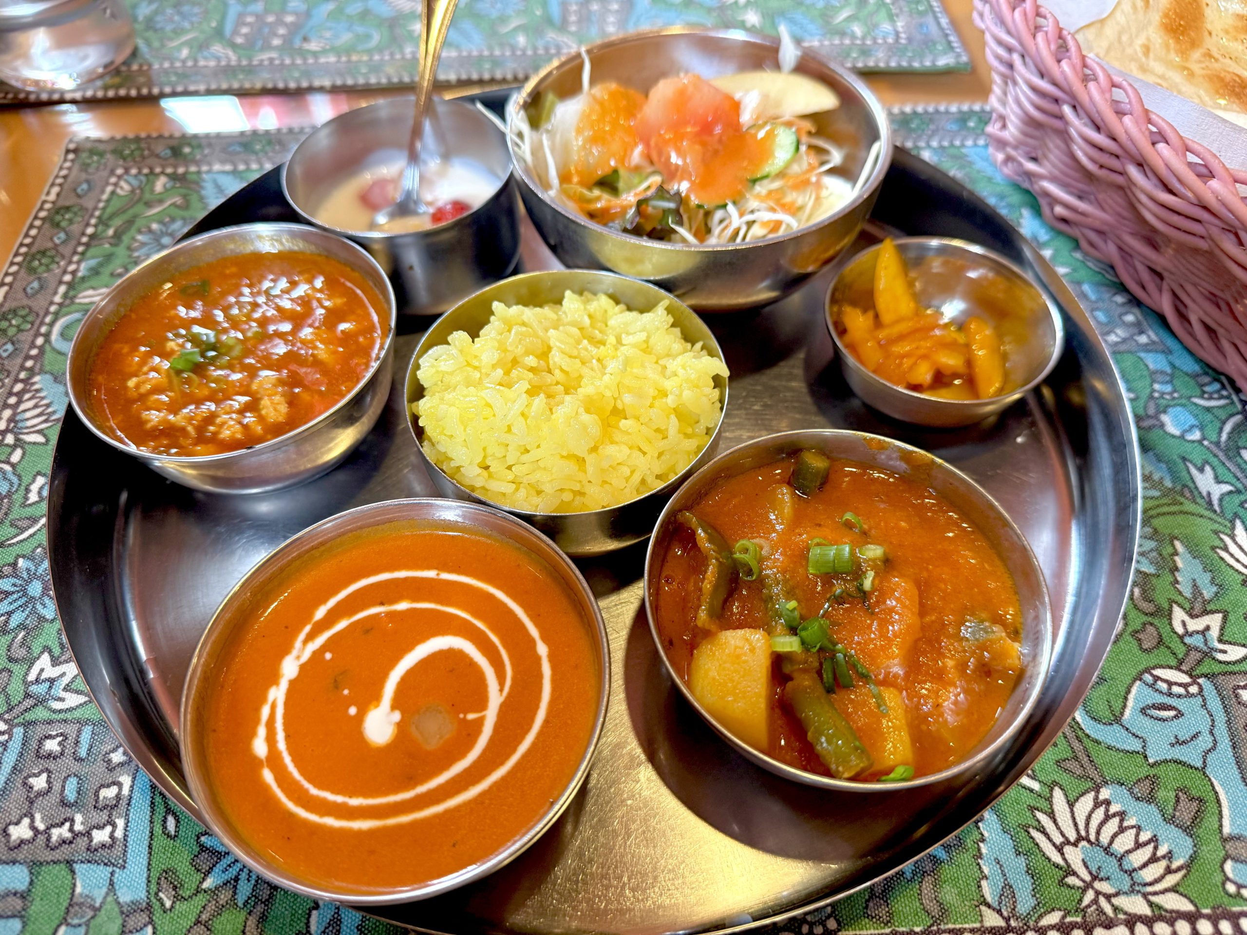 単品カレーを頼むことが多かったけど、やっぱり銀の器がズラリと並ぶとアガりますね!ディスイズ和製インド料理!