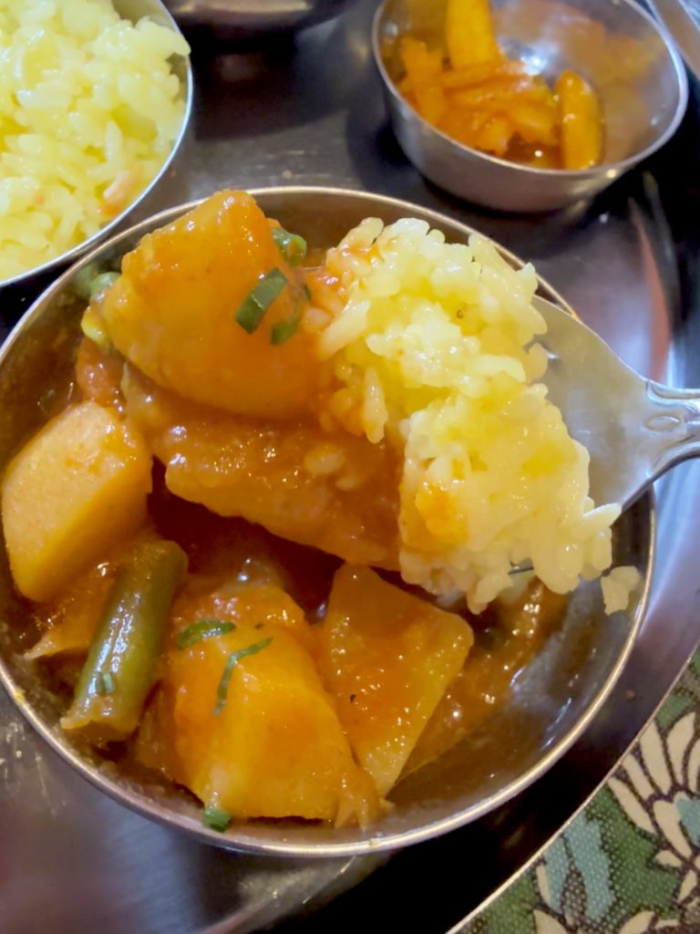 根菜たっぷりベジカレーはインディアンけんちん汁。つまりライスに合わぬはずはなし。ターメリックライスはこちらに全振りでいこう。
