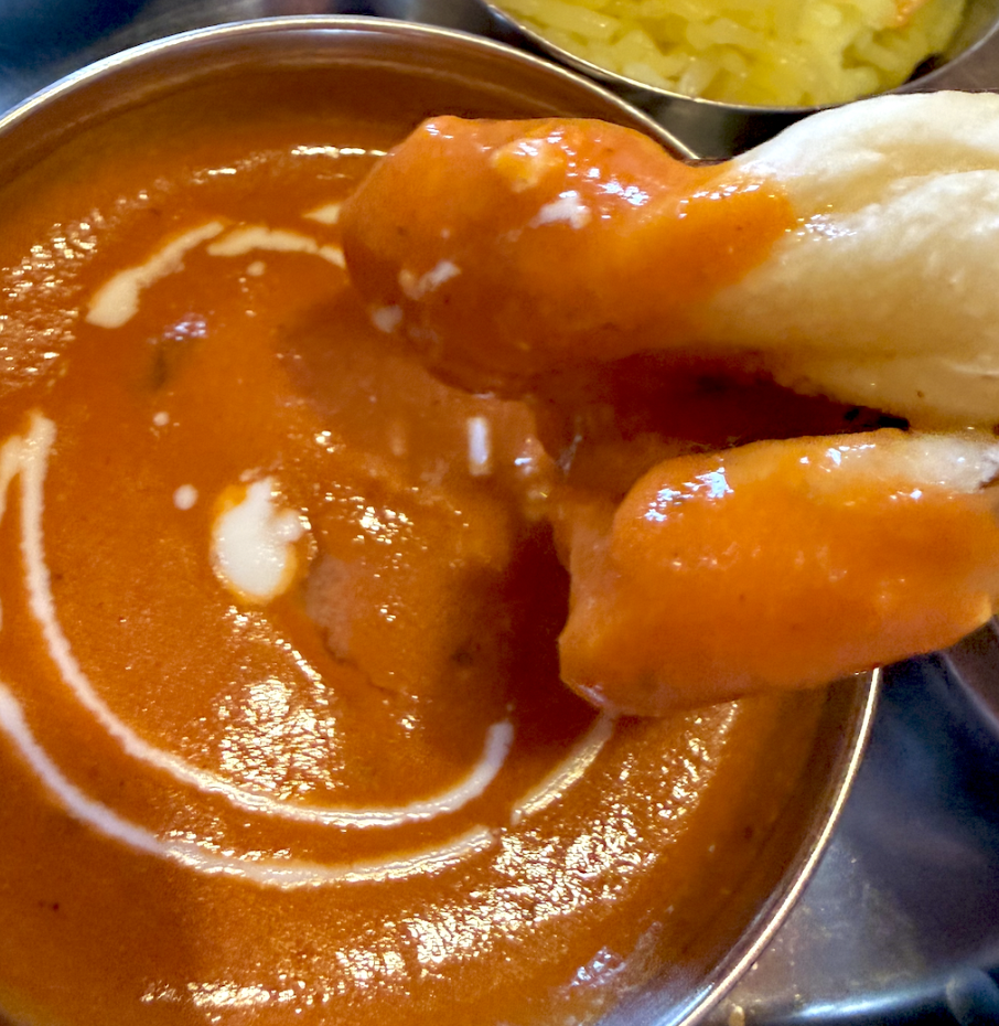 バターチキンはおなじく乳脂でテラテラの、ナンのふっくら部分と相性抜群。