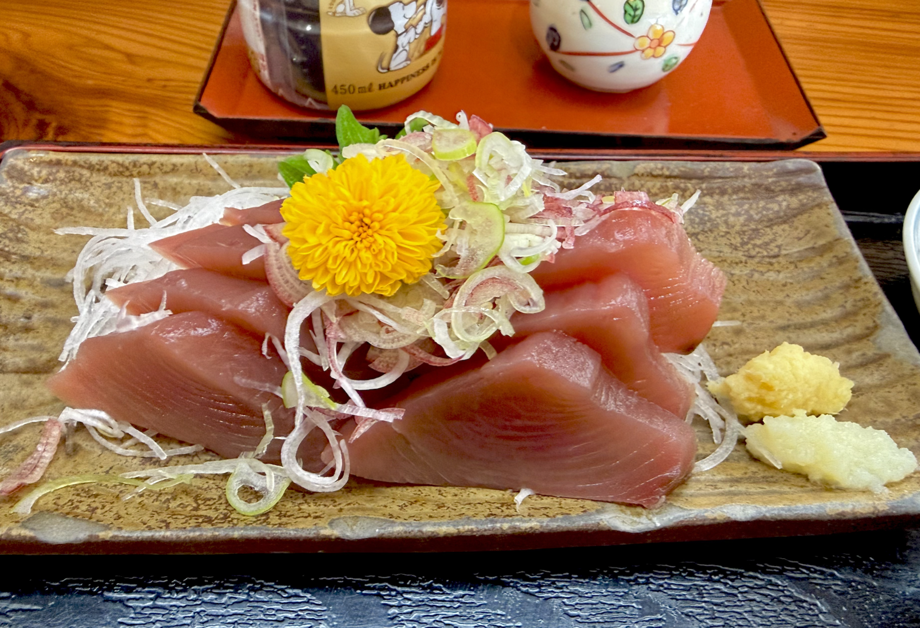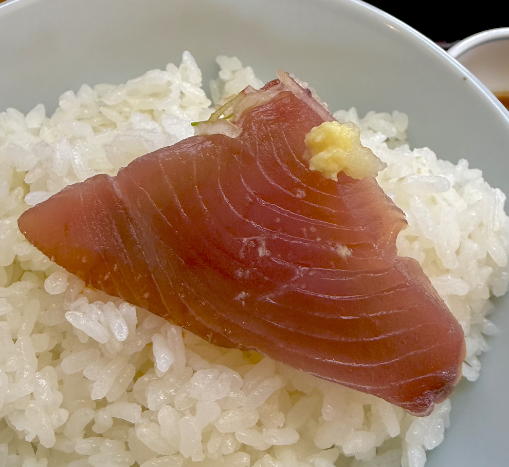 特大まこかれい唐揚や鮪ホホ肉ソースカツ丼に前後の髪を引っ張られつつ、鋼鉄の意志でかつを刺身定食を願いま〜す。