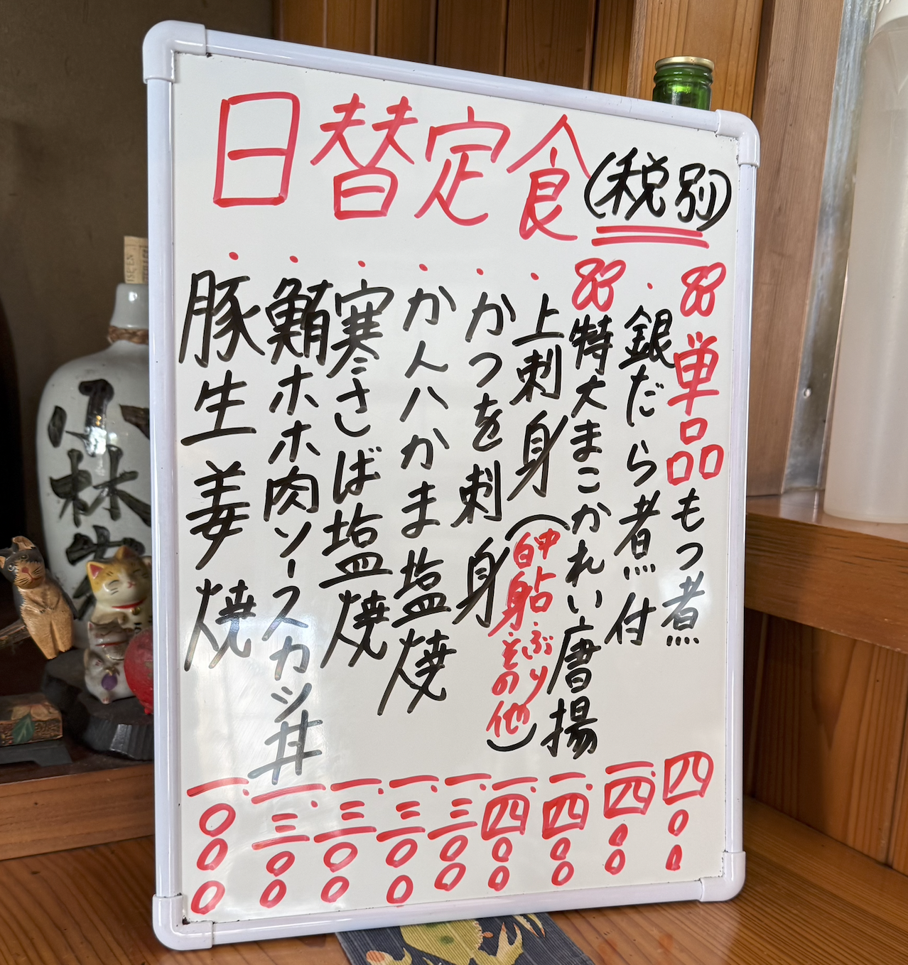日替定食のホワイトボードを指差し確認。かつを、ヨシ!