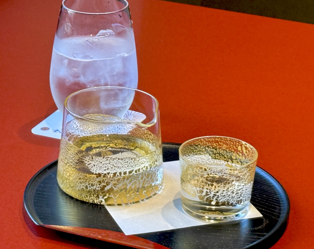 天狗舞 純米大吟醸50。美しい酒器に、黙っていても出てくる和らぎ水。加賀屋さんのサービス精神は脈々と。
