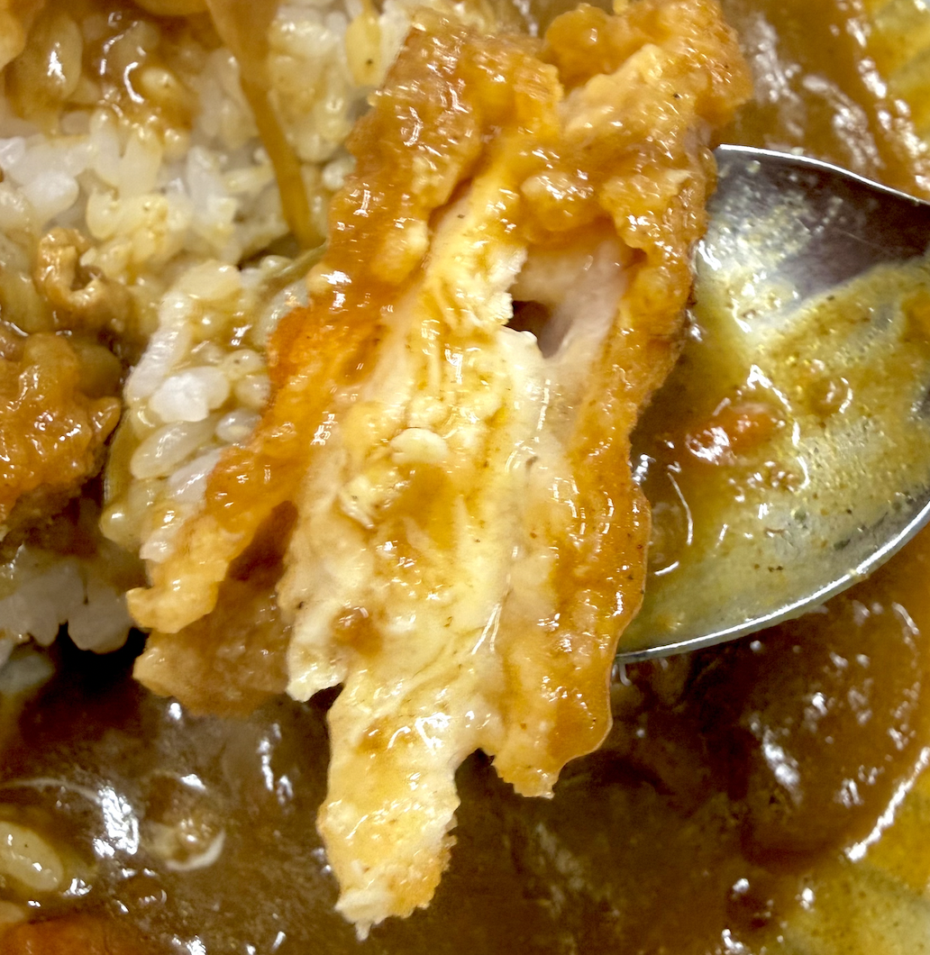 ササミチーズカツがね、なんだササミだけじゃないのと思わせておいて、薄〜いチーズがちょろっと顔を出してくれるんですよ。この控えめな主張がうまいんですよ。カレーが染みた衣のうまさは言及するまでもなく。