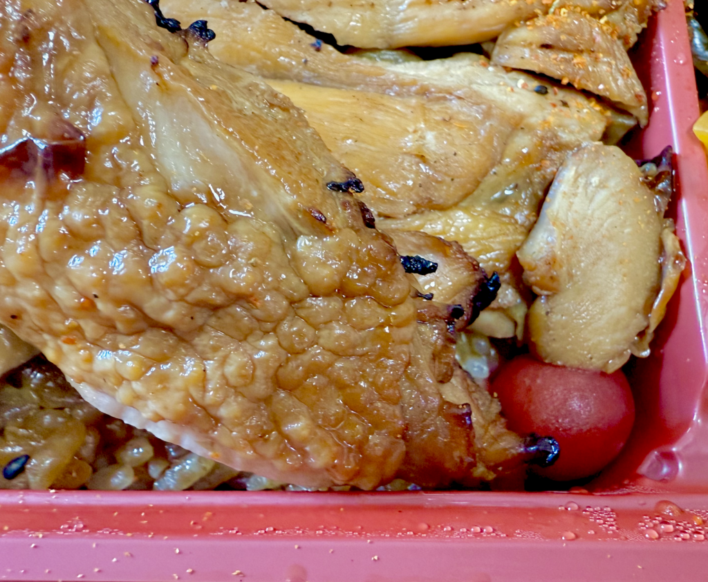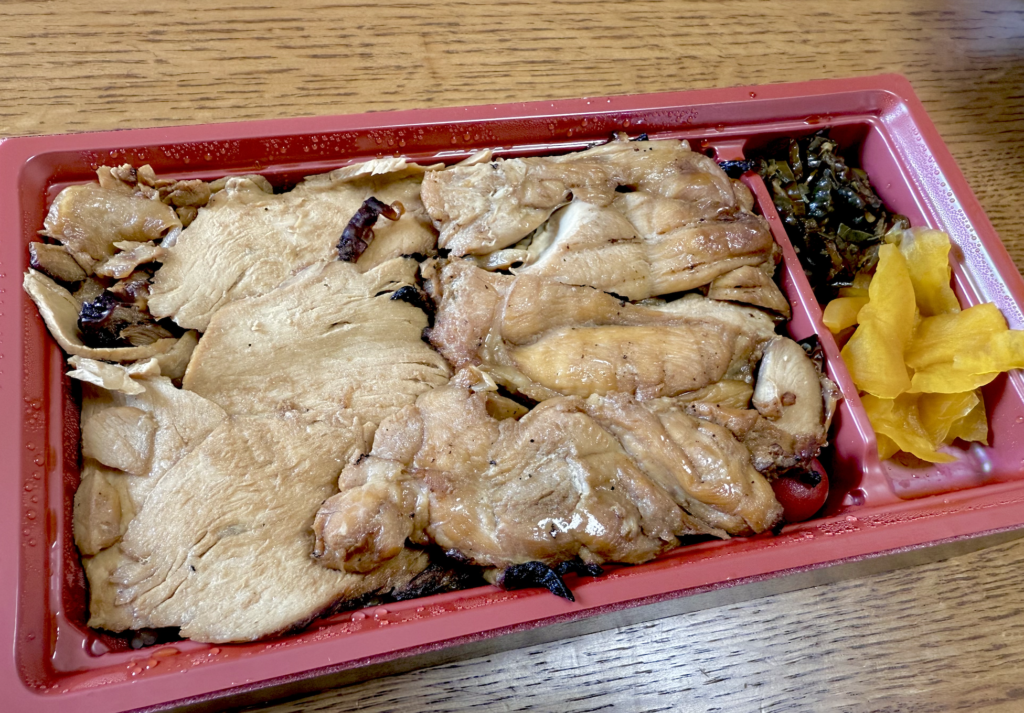 左半分は竹と共通の胸肉ゾーン。秘伝のタレが染みた胸肉スライスと、やはりタレがたっぷりかけられたツヤツヤご飯。ちょっと味が濃いくらいに感じるのが上州の流儀。おかげでメシをツマミにお酒を飲むことも可能だったりします。