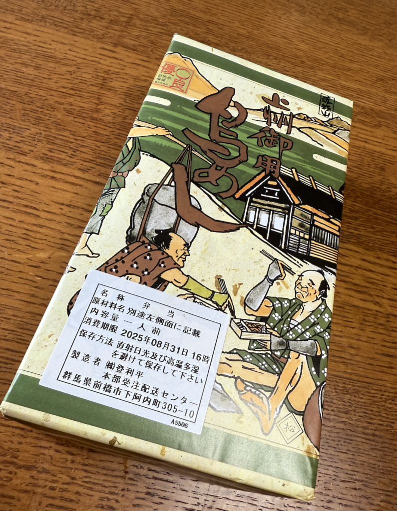 上毛三山をバックに鳥めしをつついているパッケージ。竹は茶色で松は緑です。グンマで集会等があると、茶色い箱がズラリと並んでいる光景もしばしば。