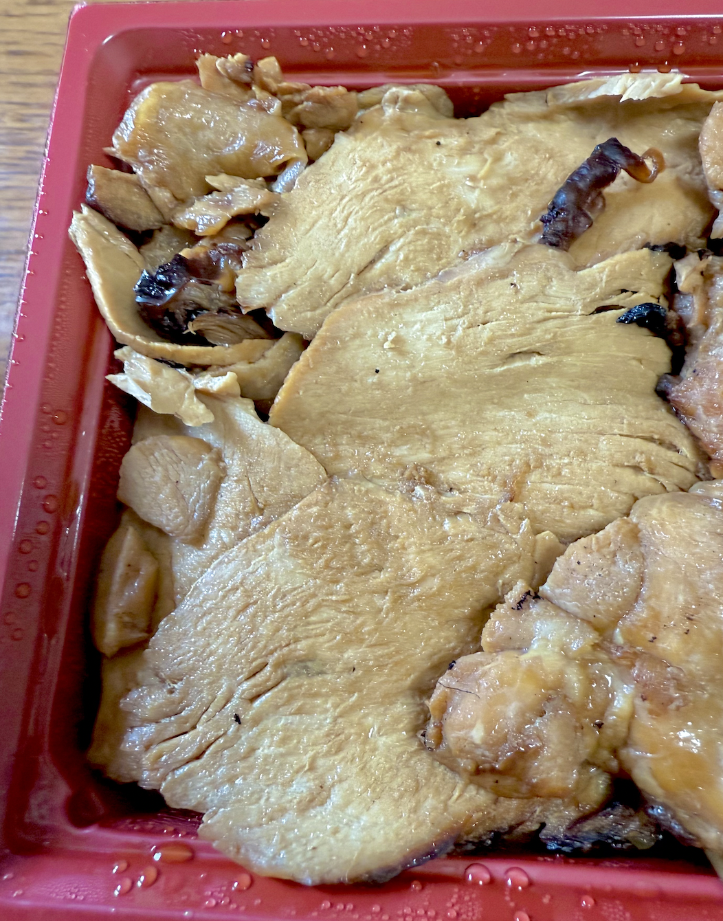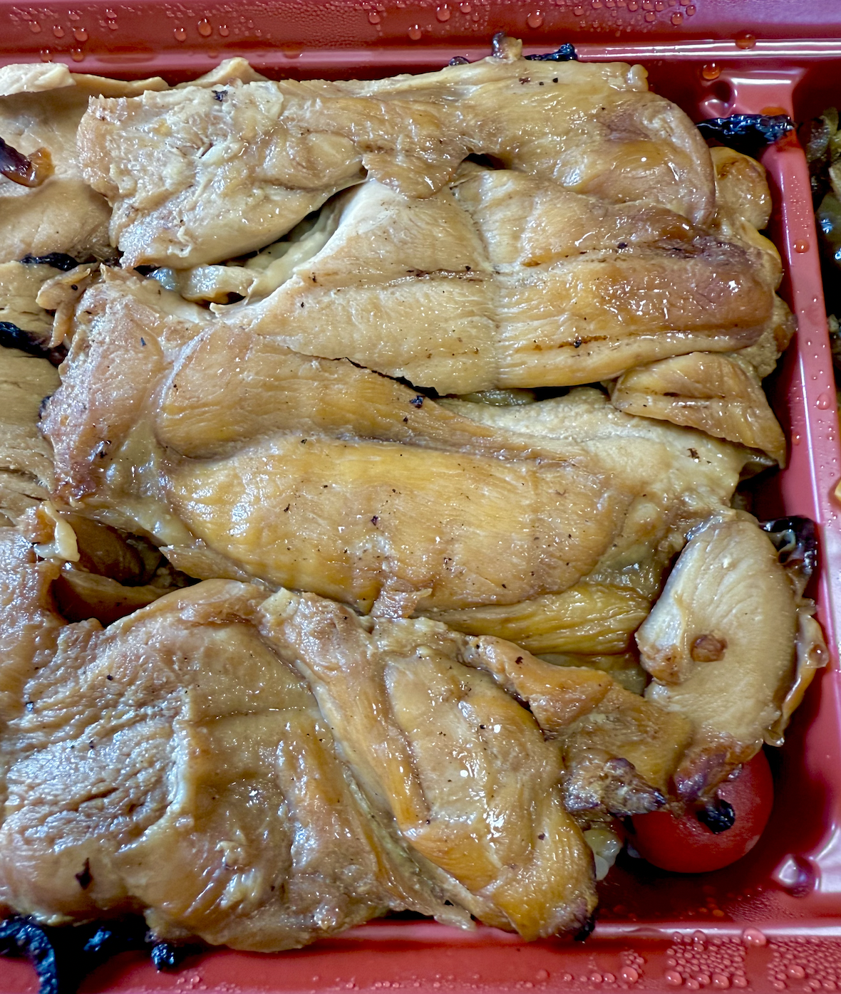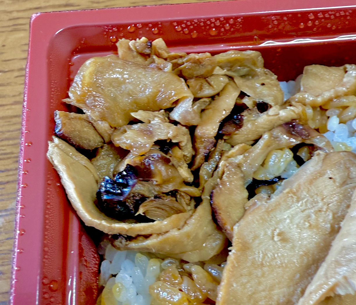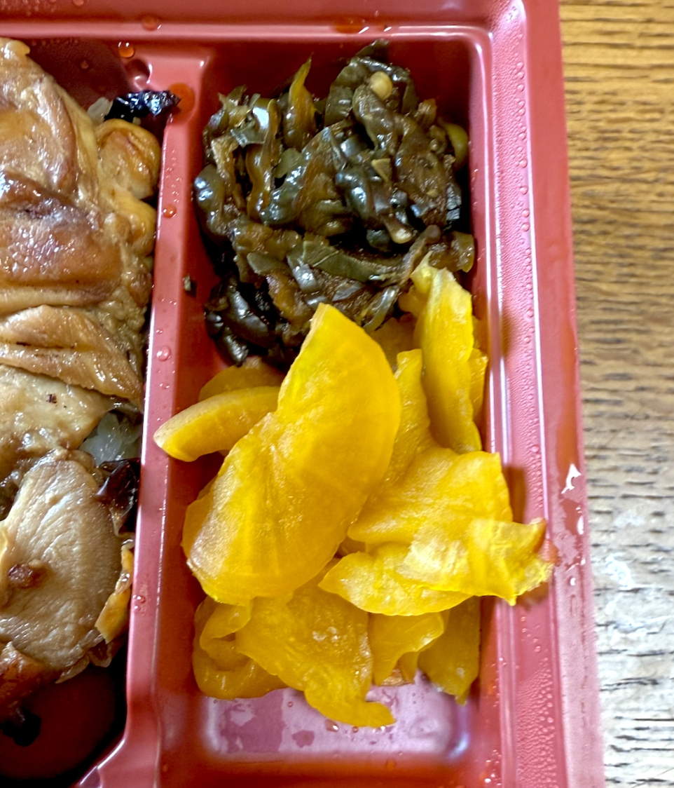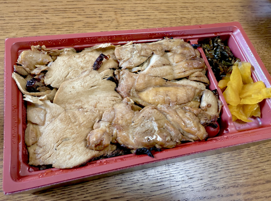 左半分は竹と共通の胸肉ゾーン。秘伝のタレが染みた胸肉スライスと、やはりタレがたっぷりかけられたツヤツヤご飯。ちょっと味が濃いくらいに感じるのが上州の流儀。おかげでメシをツマミにお酒を飲むことも可能だったりします。