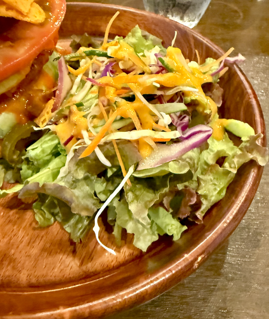とりあえずうまいサラダを食べて落ち着くんだ。でっかいバーガーにはどっさりポテトというお店が多いところ、こちらはサラダセットを選べるのが本当にありがたい。